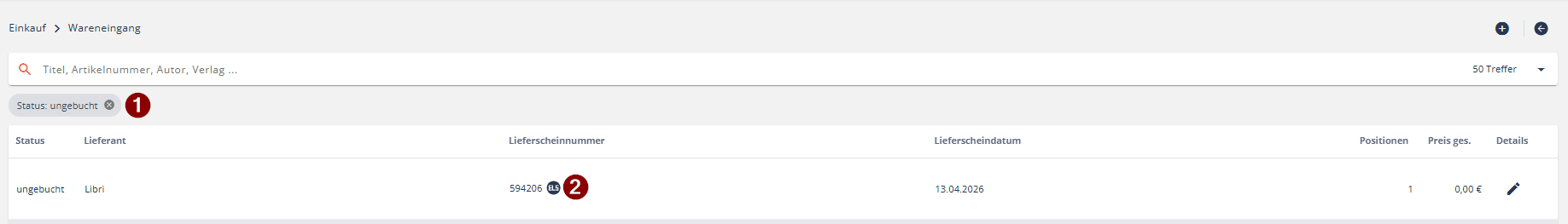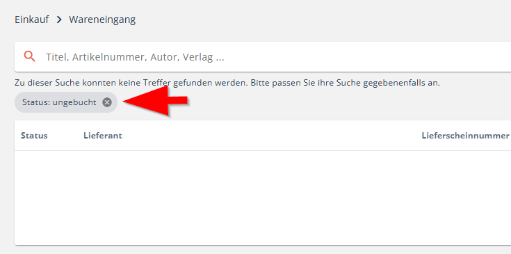 Um einen gebuchten Lieferschein zu suchen, entfernen Sie den Filter "ungebucht" unter dem Suchfeld.