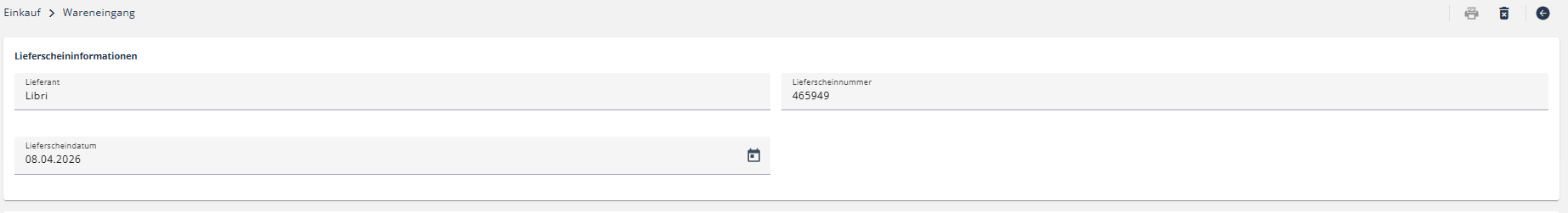 Im oberen Bereich sehen Sie den Lieferanten, die Lieferscheinnummer (entspricht der Nummer des Papierlieferscheins), dem Lieferscheindatum.