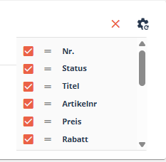 Die Spalten sind editierbar, so dass Sie die Darstellung und damit die Informationen anpassen können. Dies können Sie über das linke Zahnrad oben rechts über der Liste einstellen.
