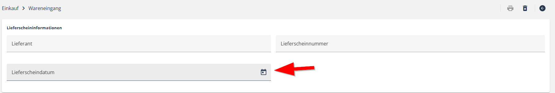 Im oberen Bereich geben Sie die Lieferscheininformationen ein. Alle Angaben sind verpflichtend. Das Lieferscheindatum können Sie eintippen (TT.MM.JJJJ) oder über den Kalender auswählen.
