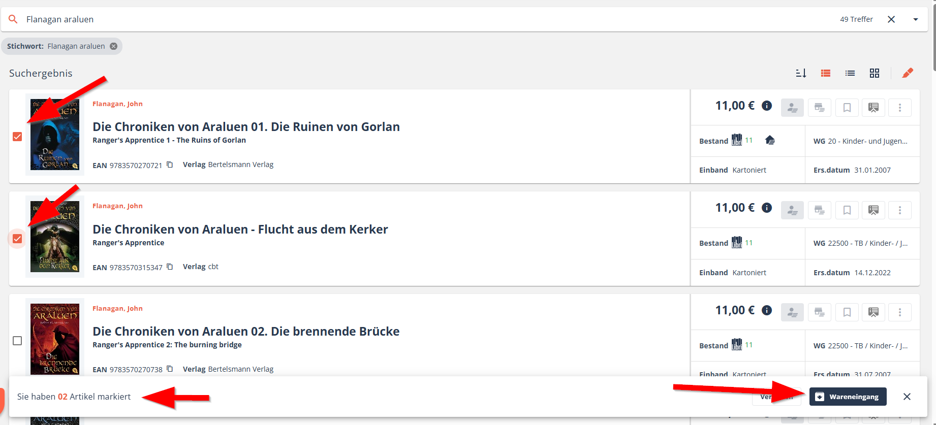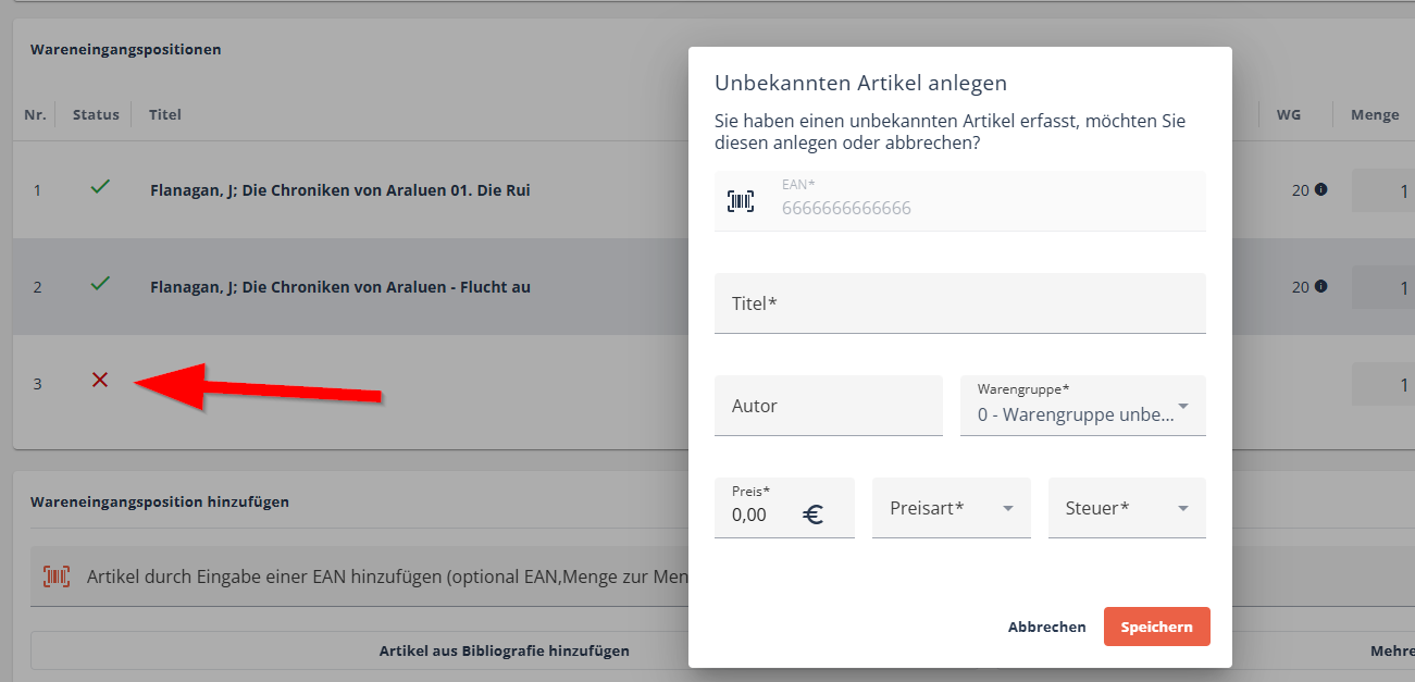 Möchten Sie Ware verbuchen, die weder im Libri-Katalog vorhanden ist noch von Ihnen als eigene Artikel angelegt wurde, weist ein rotes X darauf hin. Diese Artikel können Sie nicht einbuchen, bevor Sie sie nicht angelegt haben.