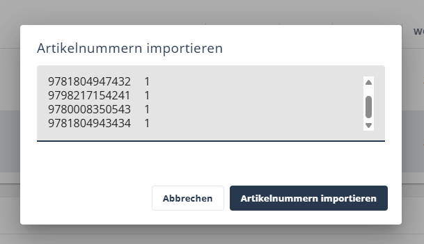 Bei "Mehrere Artikel hinzufügen" öffnet sich ein Pop-Up-Fenster, in das Sie EAN und Mengen hineinkopieren können. Um die Mengen anzugeben, können Sie diese entweder mit einer Leerzeile, einem Komma oder einem Semikolon hinter der EAN schreiben. Fehlerhaft getrennte EAN und Mengen erzeugen eine Fehlermeldung und werden nicht übernommen.