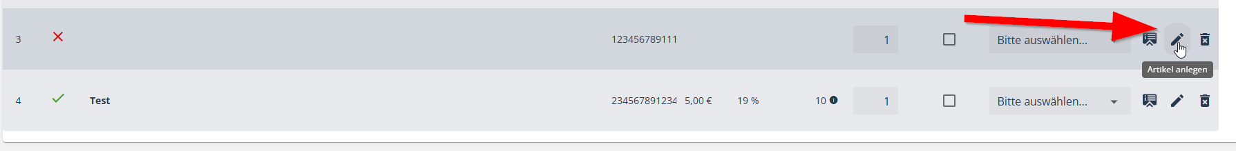 Fügen Sie mehrere unbekannte Artikel gleichzeitig hinzu, öffnet sich das Pop-Up-Fenster für die letzte Position. Alle anderen Artikel müssen Sie danach pflegen, indem Sie bei jeder Position über den Stift am Ende der Zeile gehen und damit das Pop-Up-Fenster öffnen.