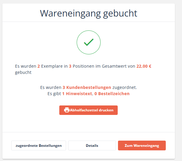 Aus dem Pop-Up-Fenster heraus können Sie ggf. Abholfachzettel drucken, sich die Details des Wareneingangs noch einmal anschauen (Sprung zurück in die Eingabemaske) oder zu den zugeordneten Bestellungen springen.