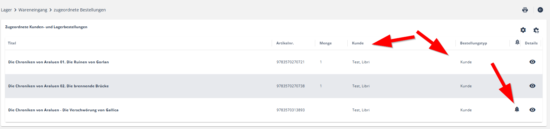 Wenn Sie nach dem Buchen des Wareneingangs auf "Zugeordnete Bestellungen" gehen, können Sie prüfen, welche Artikel für Kund*innen bestellt wurden und ob es ggf. interne Hinweise an den Bestellungen gibt. Bestellungen mit Hinweisen erkennen Sie an der Glocke.
