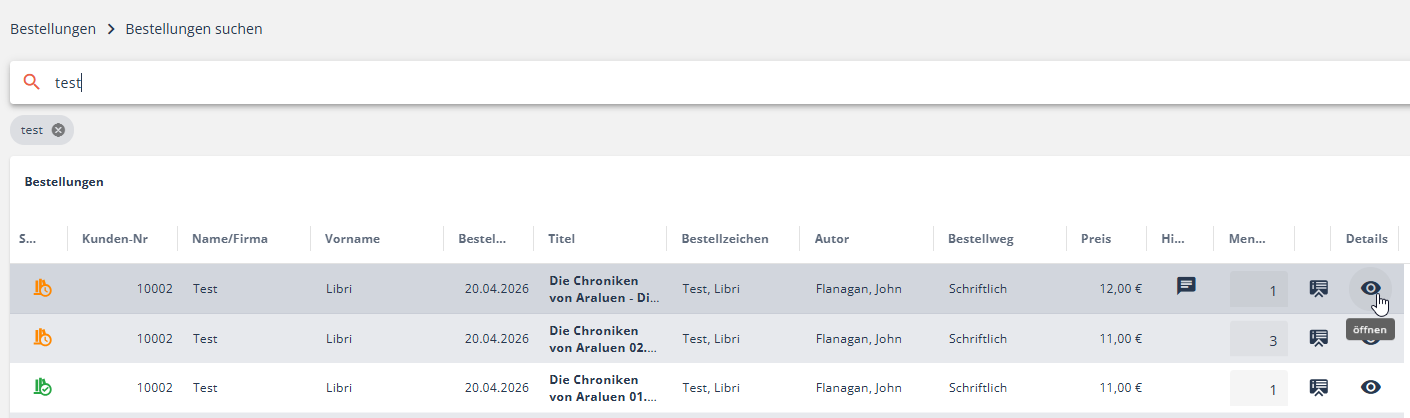 Über das Auge am Ende der Positionen können Sie die zugeordnete Bestellung aufrufen.